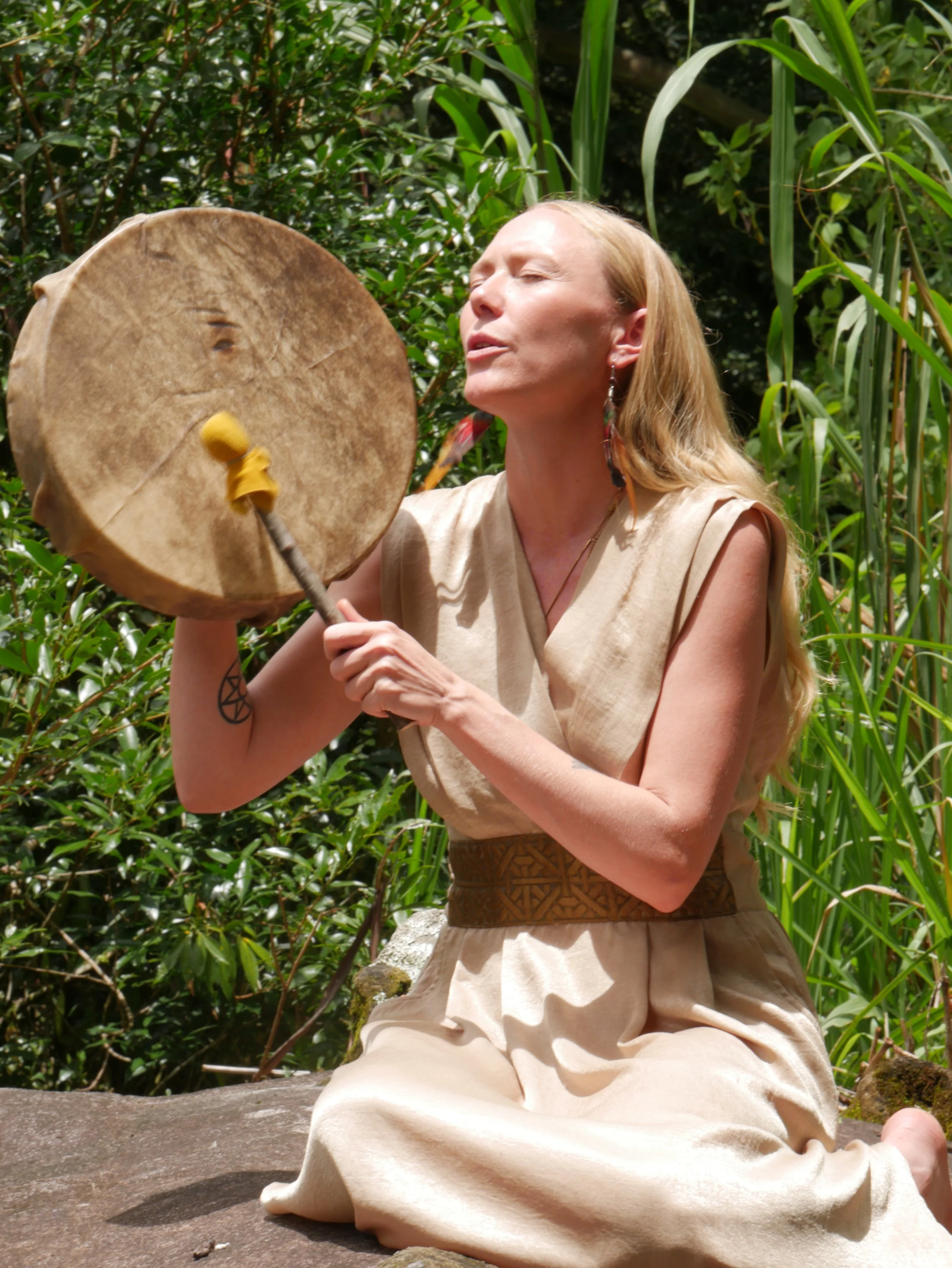 A woman dressed in beige, sitting on a rock in a lush, green, tropical environment, playing a traditional drum with a stick, her eyes closed and face expressive.